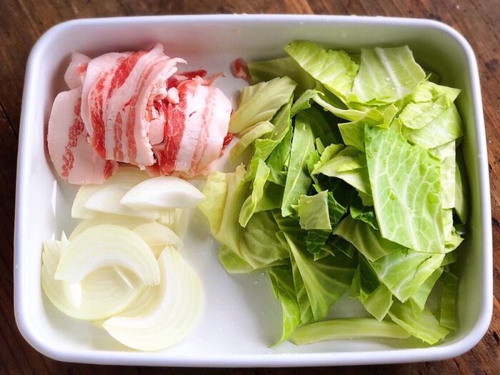 1.豚肉は4cm長さに切る。キャベツはザク切りにする。玉ねぎは薄切りにする。●は合わせておく。焼きそば麺は袋に1ヶ所穴を空け、600Wのレンジで2分加熱する。