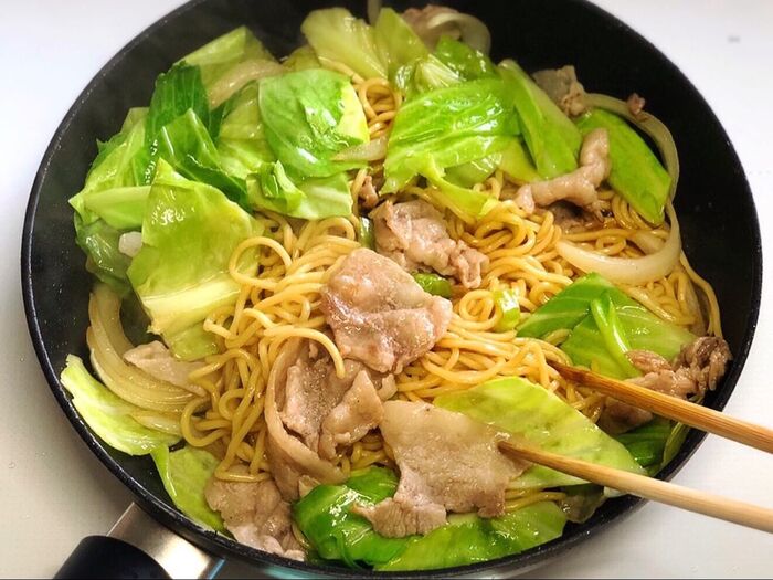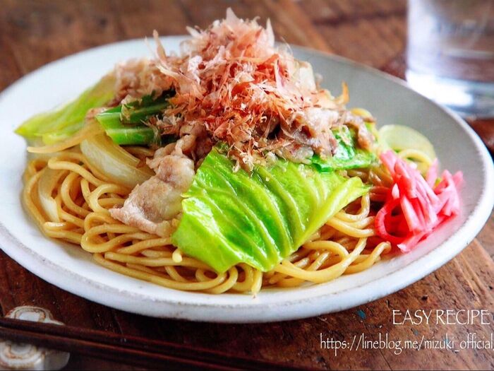 3.キャベツがしんなりしたら麺を加えてほぐし、●を加えて炒め合わせる。器に盛り、かつお節と紅生姜をトッピングする。