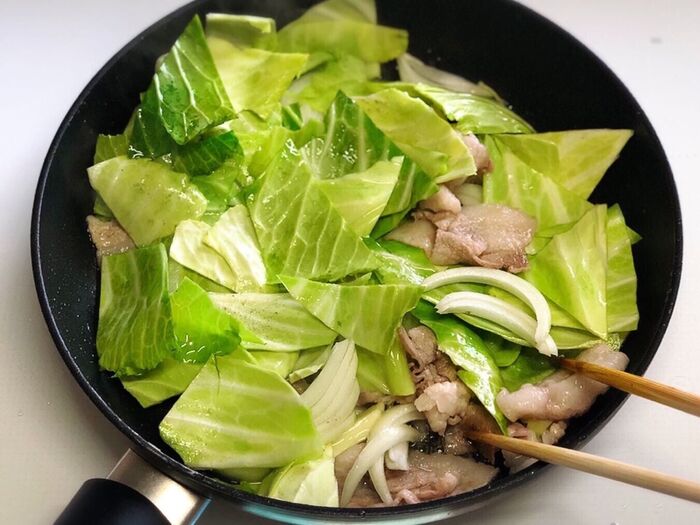 2.フライパンにサラダ油を入れて中火で熱し、豚肉を炒める。豚肉の色が変わったらキャベツと玉ねぎも加え、塩こしょうを降って更に炒める。