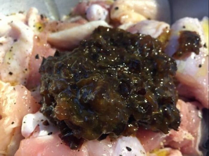 種抜きプルーンに 白ワインを加えミキサーにかけピュレ状にして鶏肉に