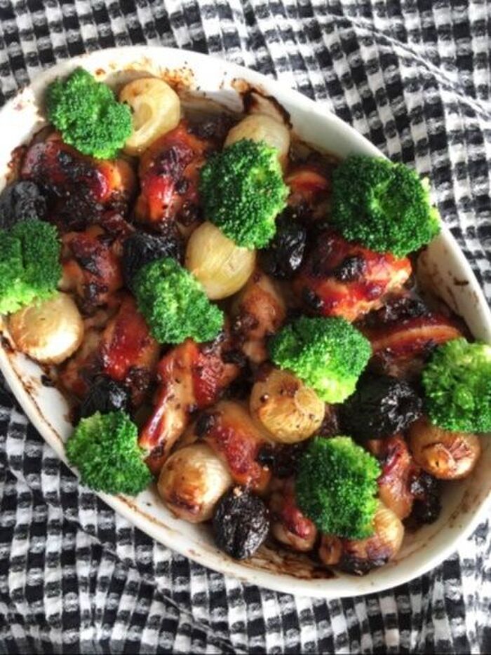小玉ねぎとプルーンをすきまに詰めオリーブオイルをかけ200℃のオーブンで