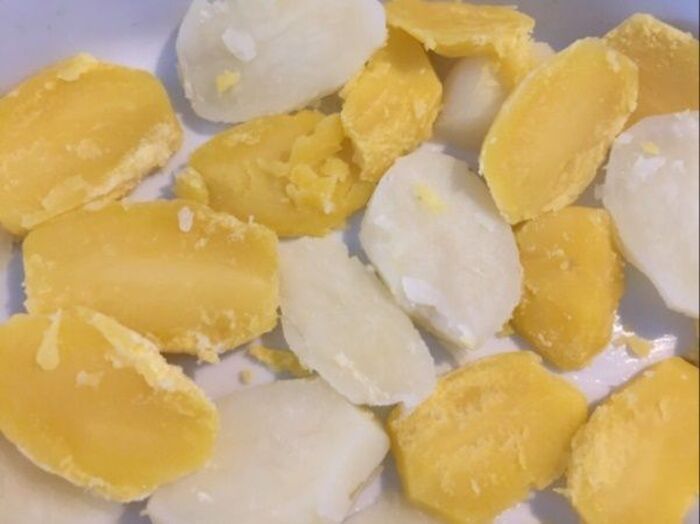 耐熱皿に茹でたジャガイモを縦に薄切りにして耐熱皿の底に敷き詰め