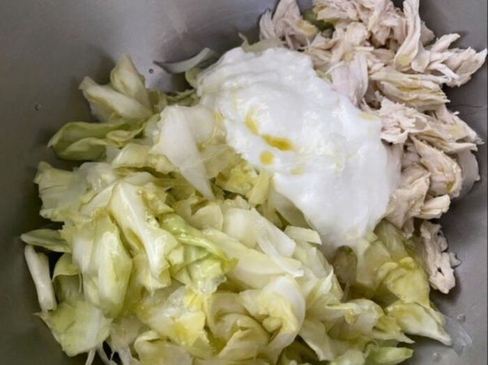 水気をしっかり絞ったら ボウルに入れ 茹でて裂いたささみを加え