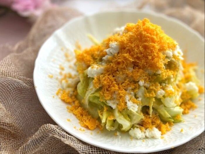 器に盛り付け ゆで卵を白身と黄身に分け茶こしなどでそれぞれ漉す
