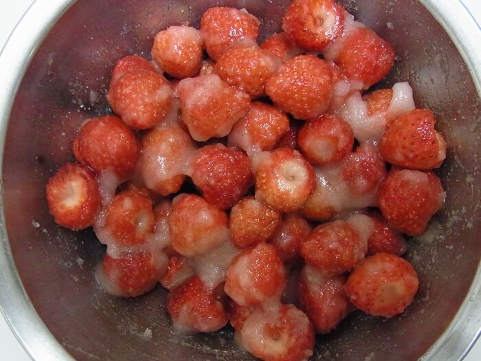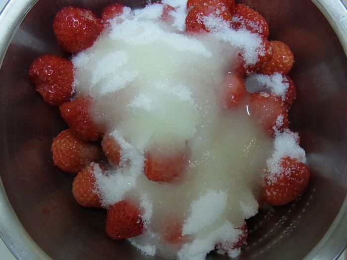 ヘタを取りボウルに移し、グラニュー糖とレモン汁を振り入れます。