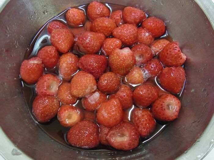 イチゴはサッと洗ってザルにとり水けを切ります。