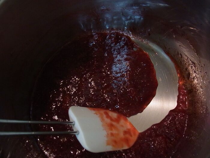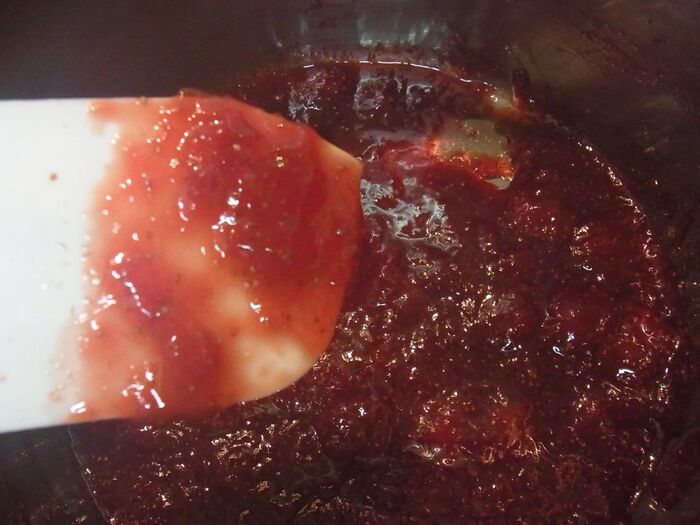 煮詰まってきたら弱火にしてゴムベラで果肉をつぶします。