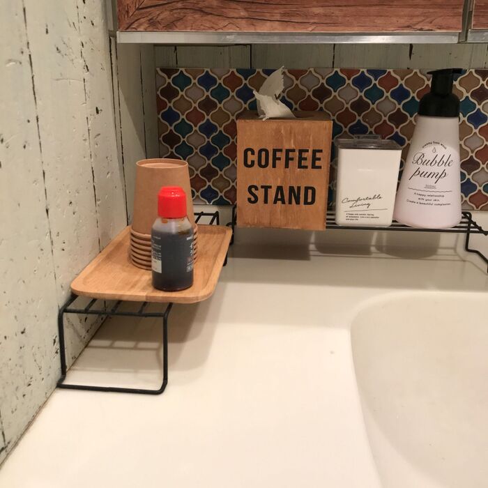 トップ画像のように2つをクロスさせ、洗面台の角に置き、綿棒ケースやハンドソープなどを置いています。