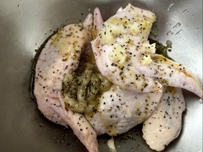 黒こしょうをふり オリーブオイル大さじ1を加え よくもみこみ