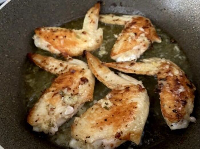 フライパンにオリーブオイル小さじ2を加え鶏手羽先の皮目の方から