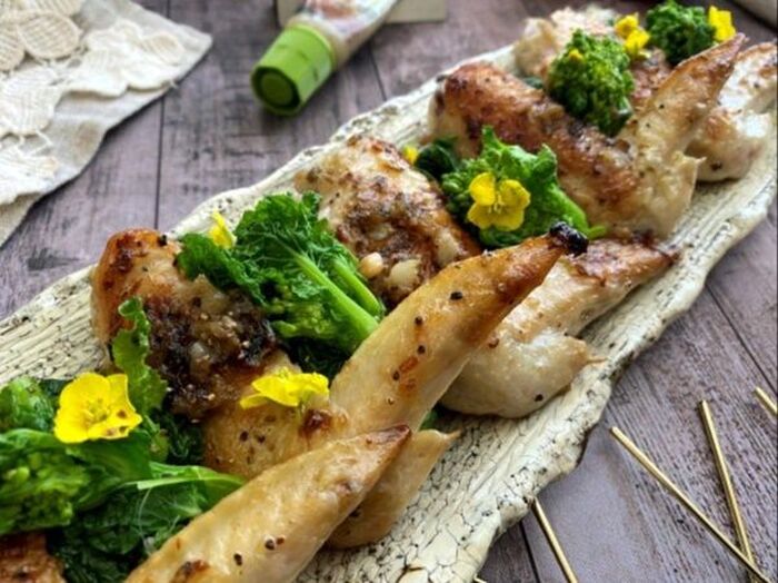 茹でた菜の花を食べやすい大きさに切り 器に鶏手羽先とともに盛り付け