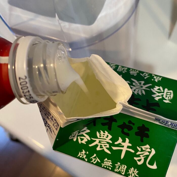 新品の牛乳パックから、追加で投入するヨーグルト分の牛乳をとり出し、お好みのヨーグルトを投入。