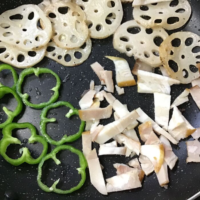 フライパンに大さじ1のオリーブオイルを入れてベーコンとレンコンとピーマンを炒めておく。