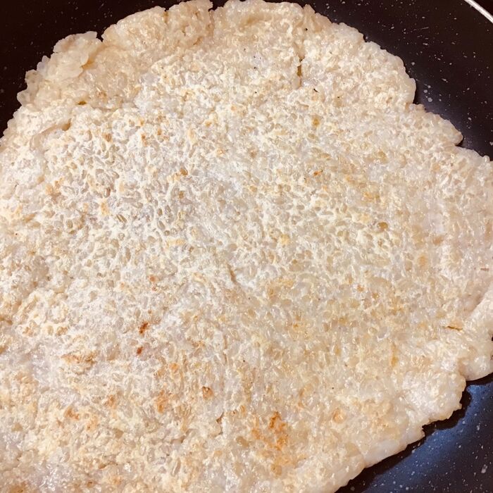 2のフライパンに玄米ごはん作った生地を入れ両面を焦げ目がつくまで弱火で焼く。