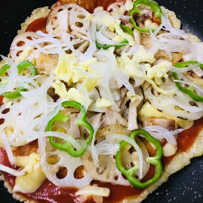 フライパンの玄米ごはん生地にピザソースを塗って、ピーマン、ベーコン、レンコンとピザ用チーズとオニオンスライスを乗せて、蓋をしてチーズが溶けるまで焼いて出来上がり。