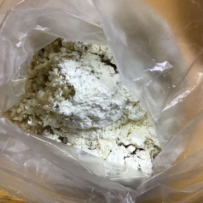 ビニール袋(アイラップなど厚手のもの)に触ることができる温度に温めた玄米ごはんと天ぷら粉とオリーブオイル小さじ1を入れて
