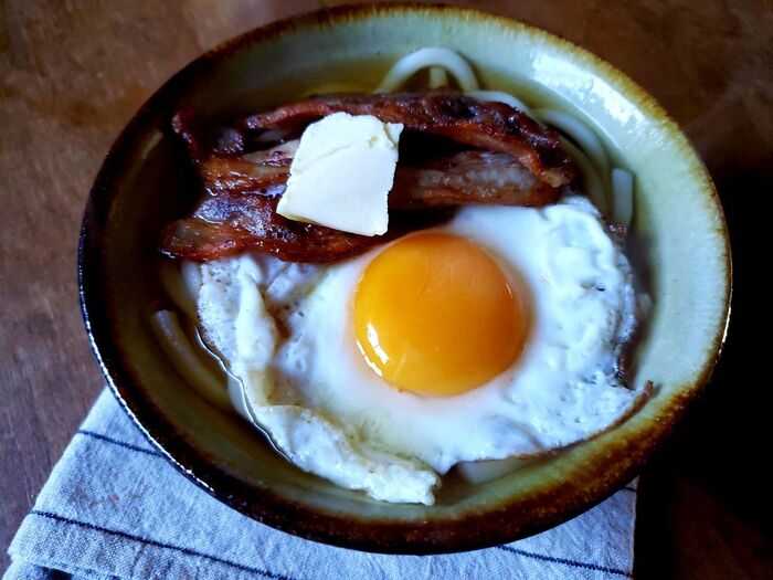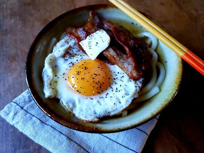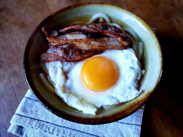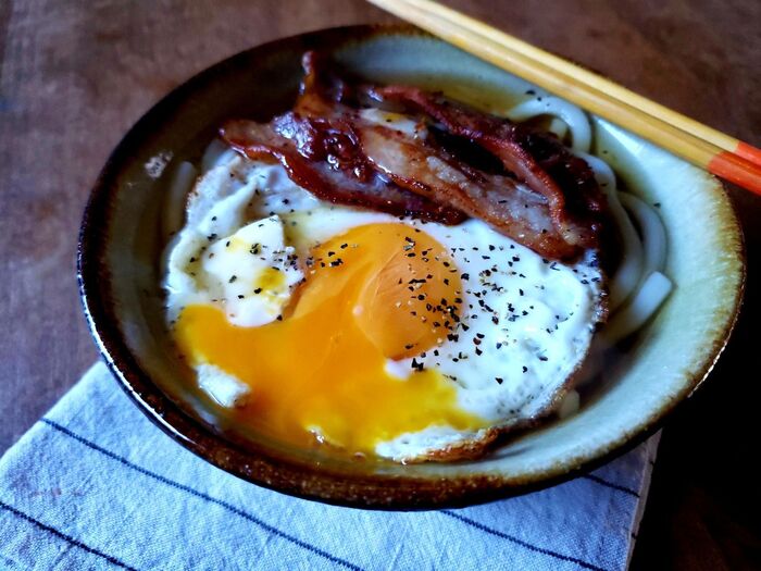 ベーコンの塩気がプラスされるので、うどんスープは濃くないものの方がいいです。