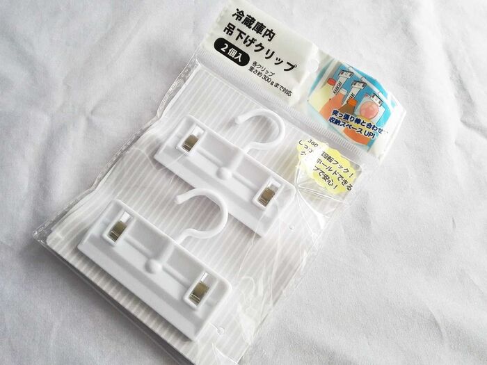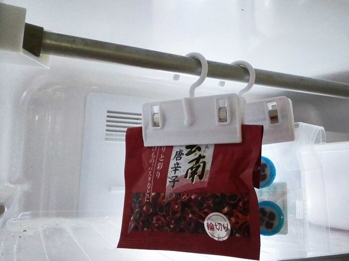一緒に販売されている「冷蔵庫内吊下げクリップ」を使うと、袋物や調味料を吊下げて収納することが可能。