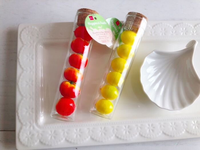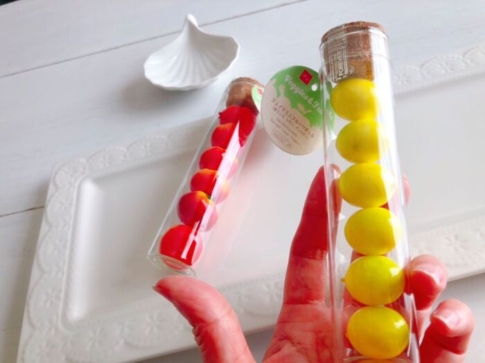 ガラスボトルは縦13.5㎝の手のひらぐらいの大きさで種類はレモンとトマトの他に赤りんご、青りんご、ピーチ、パンプキンがありどれも可愛いですよ♡