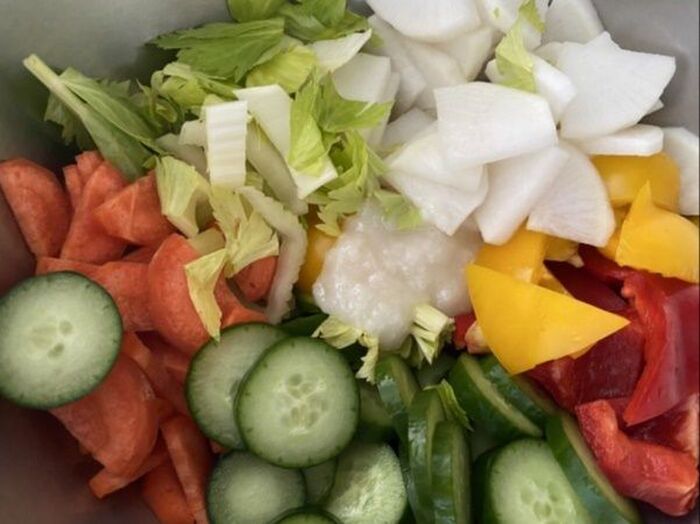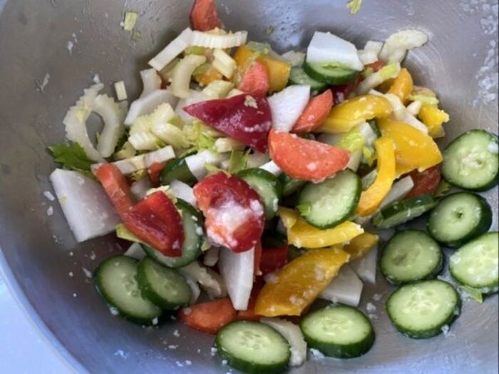 セロリは筋を取り1㎝幅の輪切り きゅうりは5㎜幅の輪切り 赤・黄パプリカは