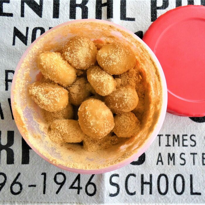 我が家は、タッパーにきな粉と砂糖を入れておいて、茹で立ての豆腐入り白玉団子を入れて蓋してシャカシャカすると・・・きな粉をまとったお団子完成!!容器もそのまま出せて便利です!!