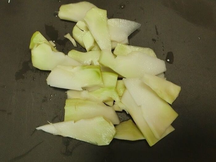 ザーサイは周りの皮を厚めにむいて、薄切りにします。