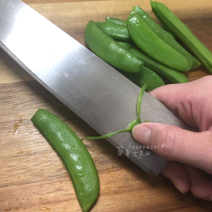 沸騰した鍋にスナップエンドウを入れて、約1分茹でてザルにあげておき、あら熱がとれたらスジをとって斜め半分に切る。《中火》
