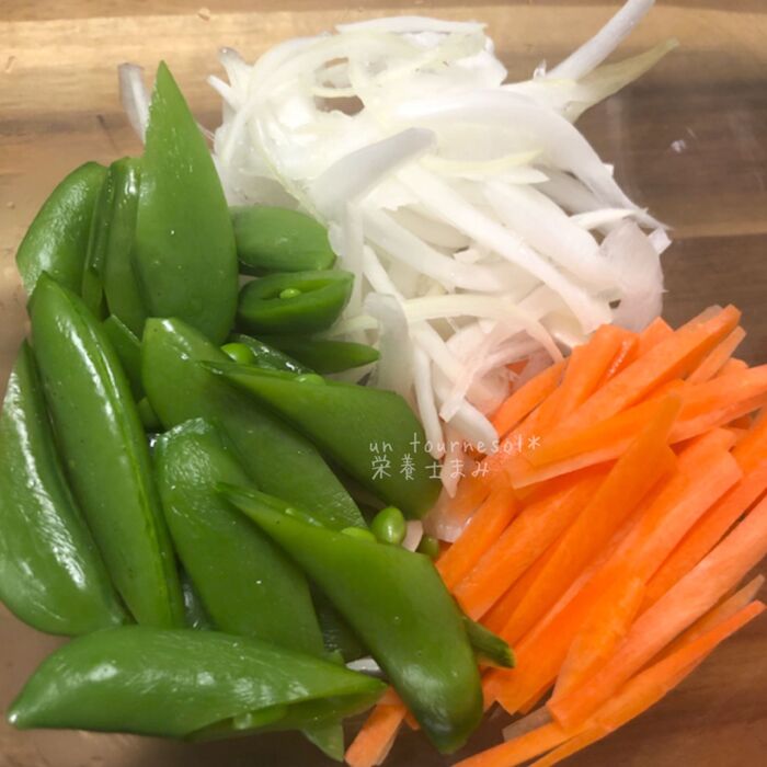 混ぜ合わせた☆を、水気を絞った玉ねぎとスナップエンドウ・にんじんと混ぜれば完成‼︎