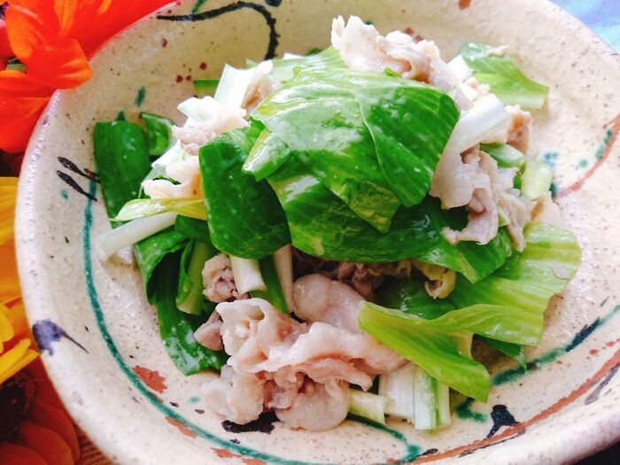 8.大きめのボウルに豚バラ肉、うるい、5のドレッシングを加えて全体を和える