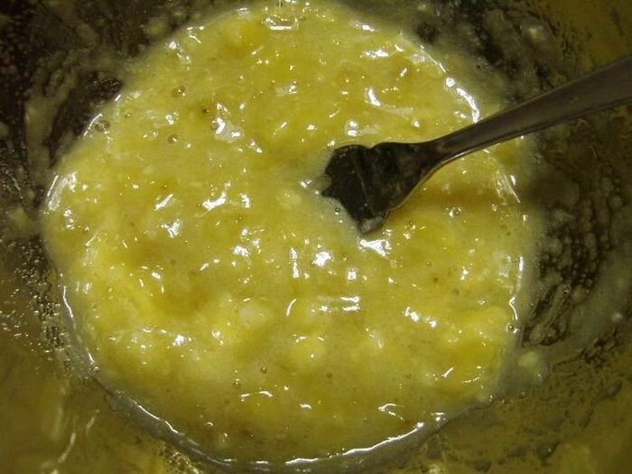はじめ、バナナと牛乳を、よく混ぜ合わせてから、フォークを泡立て器に見立てて、シャカシャカと動かして、泡立てます。