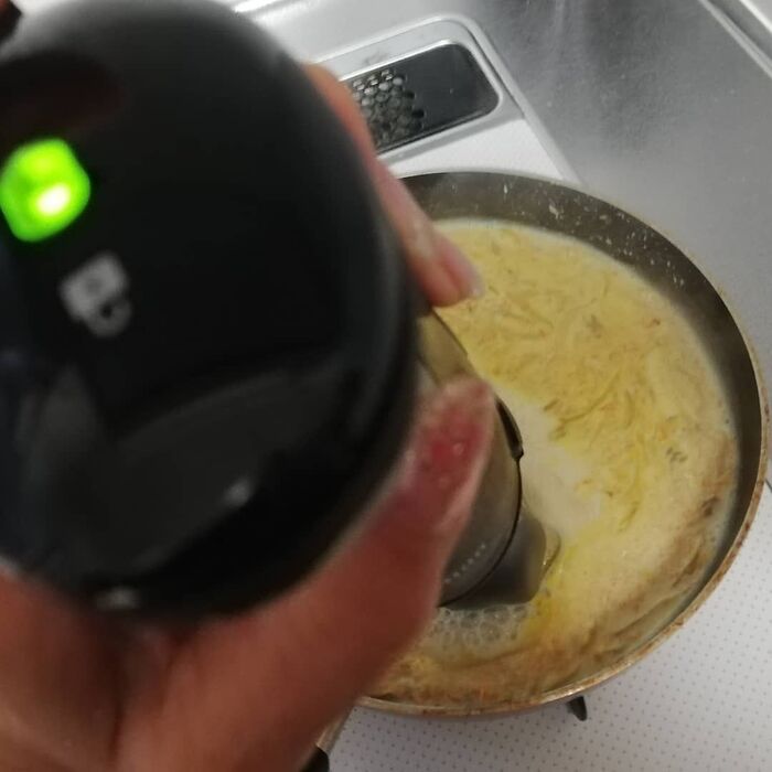 牛乳を入れて、ブレンダーで撹拌する。コンソメを入れる。