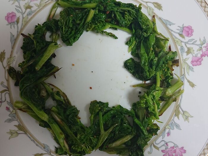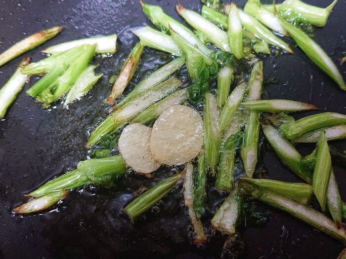 葉を加え、シュリンプソルト、こしょうで味付けする。