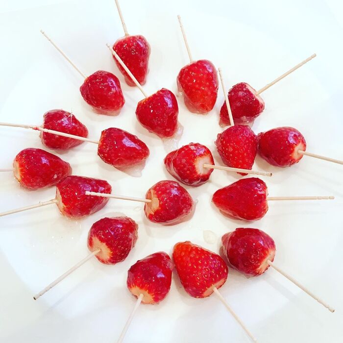 完成したいちごあめです。竹串に何個かいちごをさして飴をからませてもいいですね。