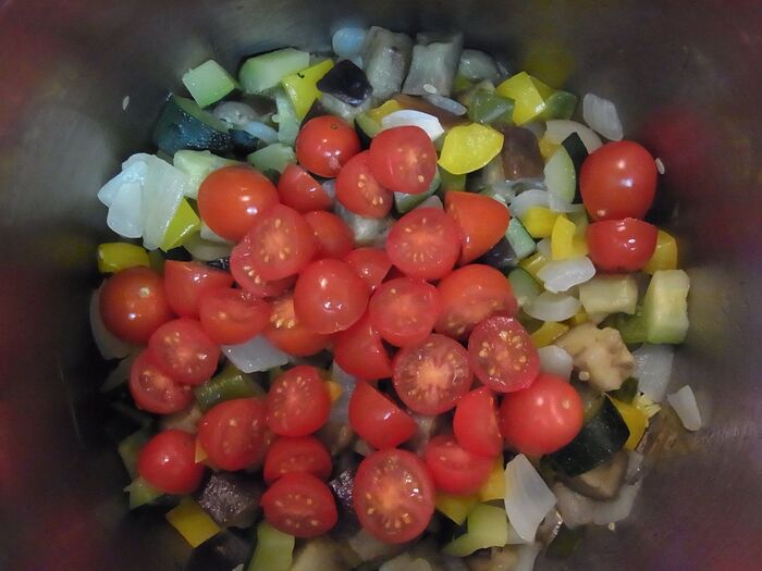 野菜がしんなりしたらプチトマトを加え軽く混ぜ、フタをします。