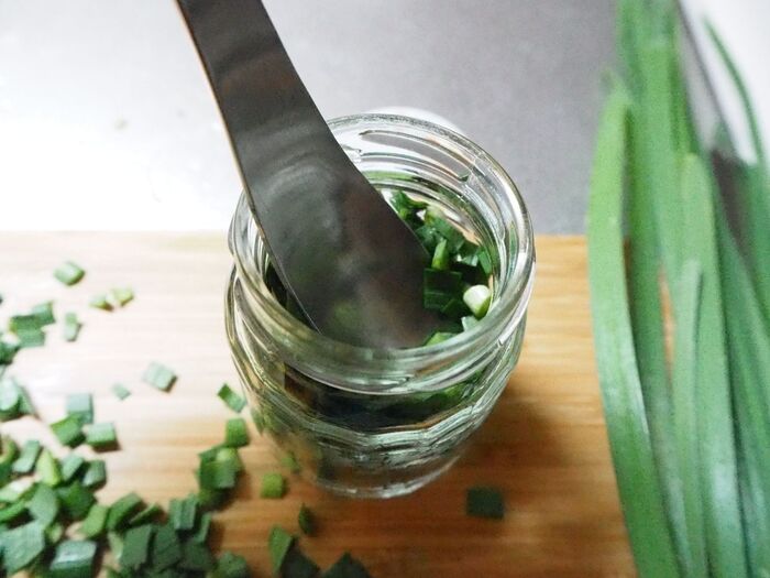 保存瓶に、ニラをスプーンで押し込みながらパンパンに詰めます。