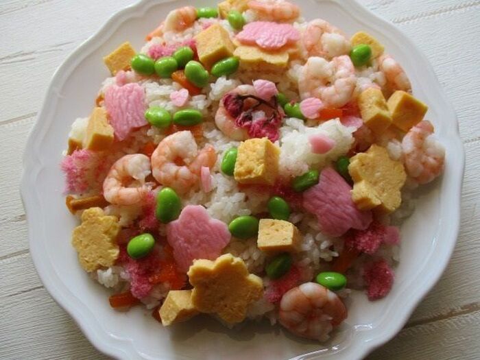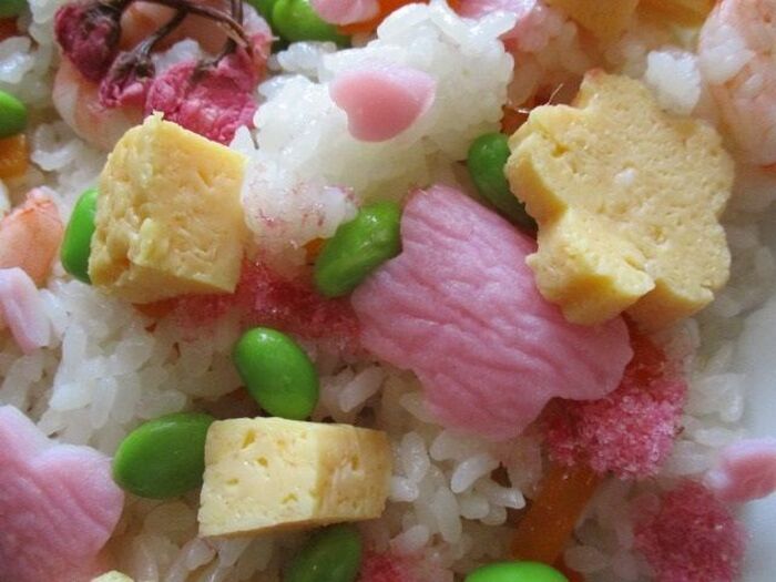 ステップ②:ちらし寿司の上に、①のボイルえび、枝豆、桜でんぶと共に、トッピングします