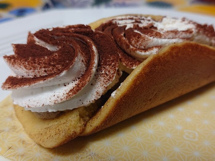 不思議な形をしているなと思って裏を見てみたら・・・先端部分にどら焼きの生地1/4が足されていました(笑)。ここでたっぷりのクリームを支えてくれています。