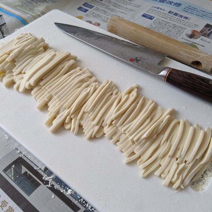 打ち粉をして、生地を三つ折りにし、端から切ります。(4〜5mmくらいの幅)