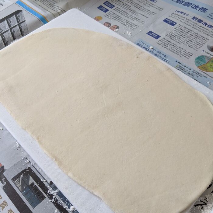 打ち粉をして、麺棒で薄く伸ばします。2〜3ミリくらい。