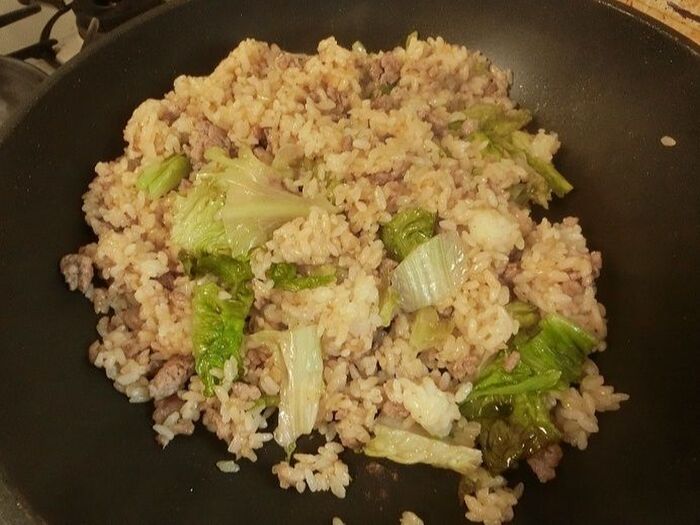 色が変わってきたら温かいご飯を入れます。