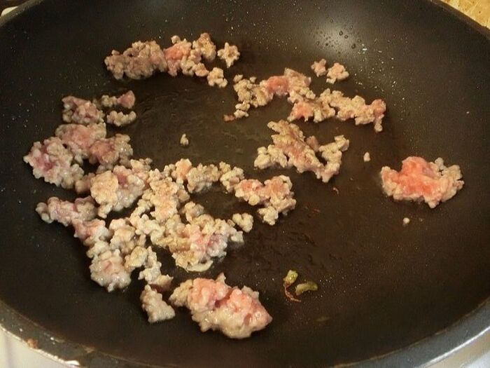 フライパンにバターと豚ひき肉を入れて炒めます。