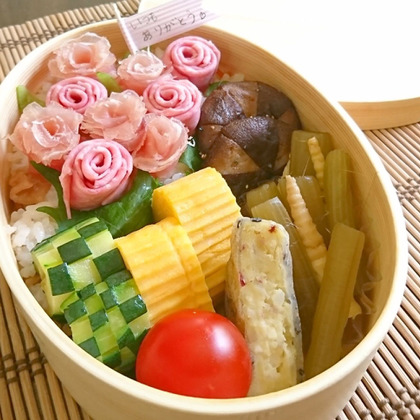 生ハムとビアハムで薔薇作り 生ハムは半分にカットしたものを3枚並べて 端からくるくる巻き→ピンセットや楊枝で花びらをひろげる。 ビアハムは、十字にハムをカットし三角のとがった方を下にむけ折りくるくると巻き→(ハム1枚で4カットできる)同じように続けて4カット分巻きつけサラスパなどでとめる。