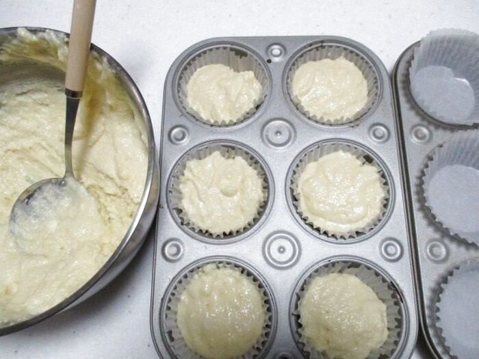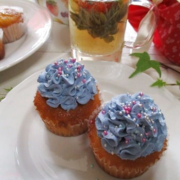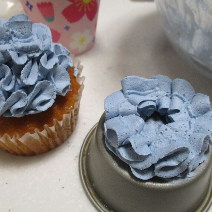 青いホイップクリームを入れ、マフィンカップの裏で、