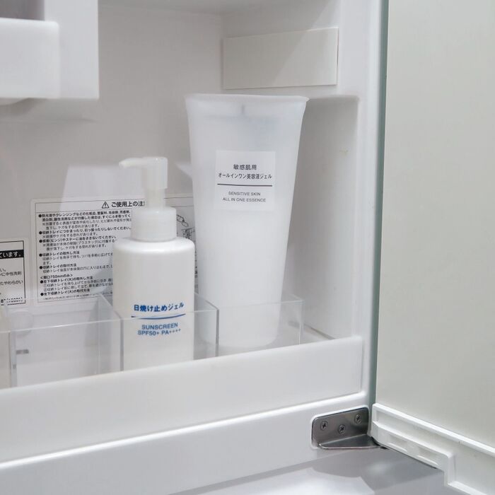 こちらは洗面台の鏡の後ろ、以前ご紹介したダイソーのCube caseにピッタリハマるというのも