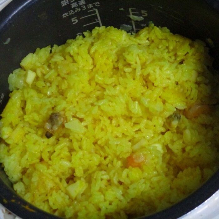ステップ②:炊飯器に、研いだ米、粗熱をとった①を加え、
