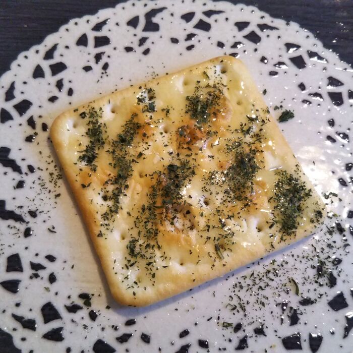 (待っている間に、市販のクラッカーにはちみつを塗り、ドライペパーミントをふりかける)