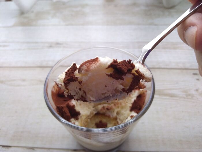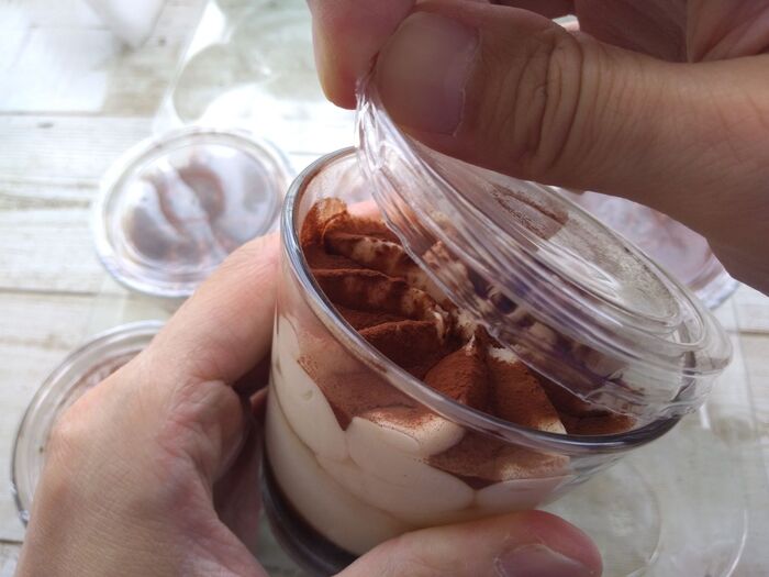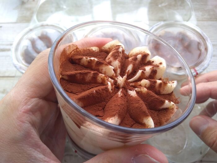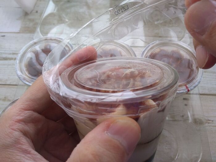 イタリアティラミスの容器で使われているカップは、チープなプラスチックではなくて、本物のガラス製の器に入っているんですよ。