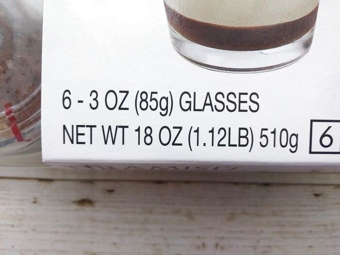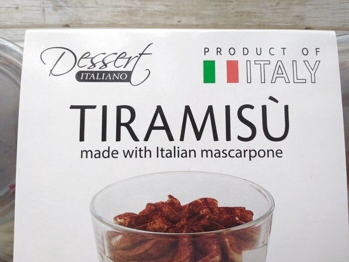 原材料名:脱脂乳、ブドウ糖シロップ、植物油、マスカルポーネチーズ、スポンジ(小麦粉、砂糖、卵、その他)、砂糖、乳たんぱく粉、卵黄、ワイン、ココアパウダー、コーヒーパウダー、シトラスファイバー、寒天/ゼラチン、酒精、乳化剤、増粘多糖類、膨張剤、pH調整剤(一部に乳成分・小麦・卵・ゼラチンを含む)