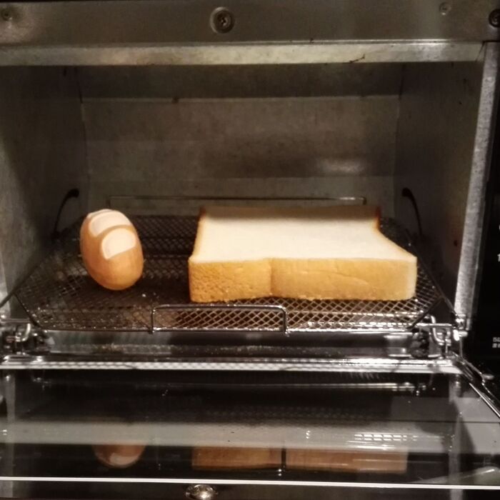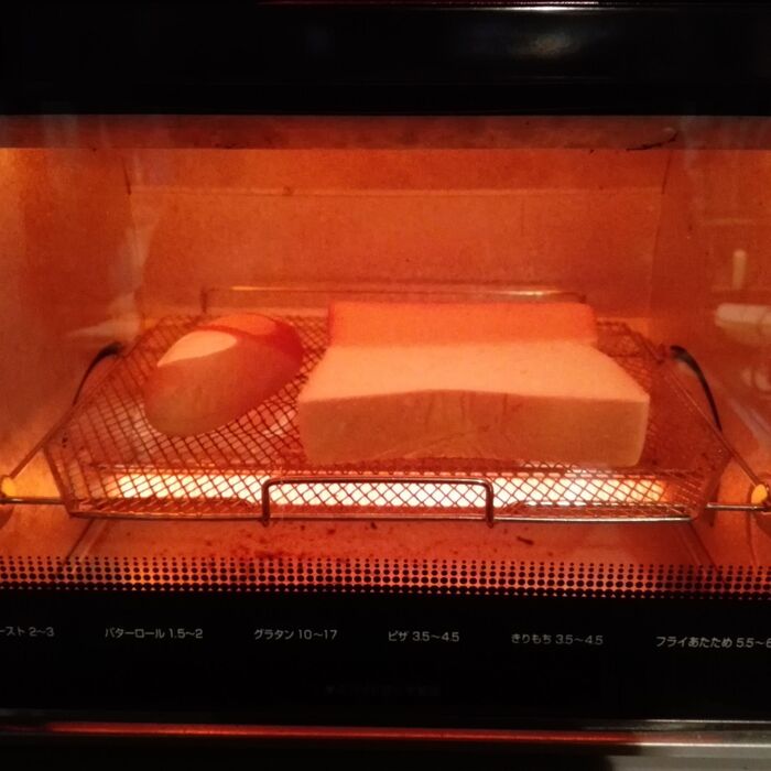 このフランスパンを流水にサッとくぐらせ、(2秒程度)パンと一緒に焼くだけ。