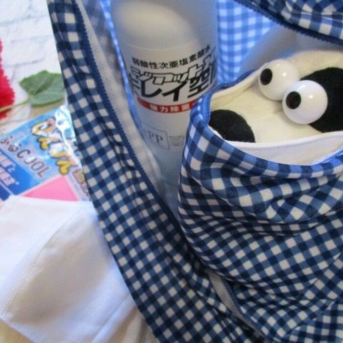 水に濡らして絞って、顔につけているマスクの上から、覆うように巻いて、後ろで結ぶと